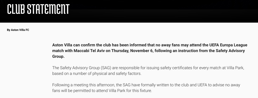 “在今日下午的会议后,安全咨询小组已正式致函阿斯顿维拉俱乐部及欧足联,告知本场比赛将不允许客队球迷进入维拉公园球场观赛,” 俱乐部在声明中称,“西米德兰兹郡警方已向安全咨询小组说明,他们对球场外的公共安全以及当晚应对潜在抗议活动的能力存在担忧。”