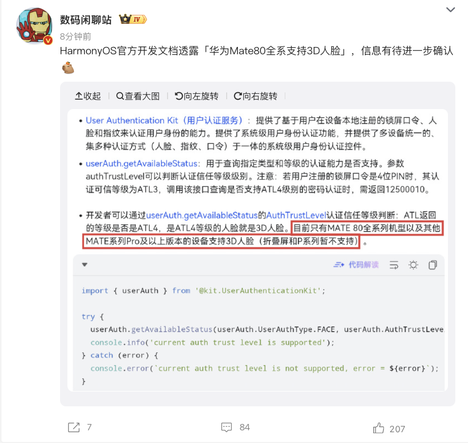 IT之家 10 月 25 日消息趣操盘趣操盘,据鸿蒙 HarmonyOS 官方开发文档,其中显示“华为 Mate 80 全系支持 3D 人脸”,不过对此博主 @数码闲聊站 补充称相应信息“有待进一步确认”。